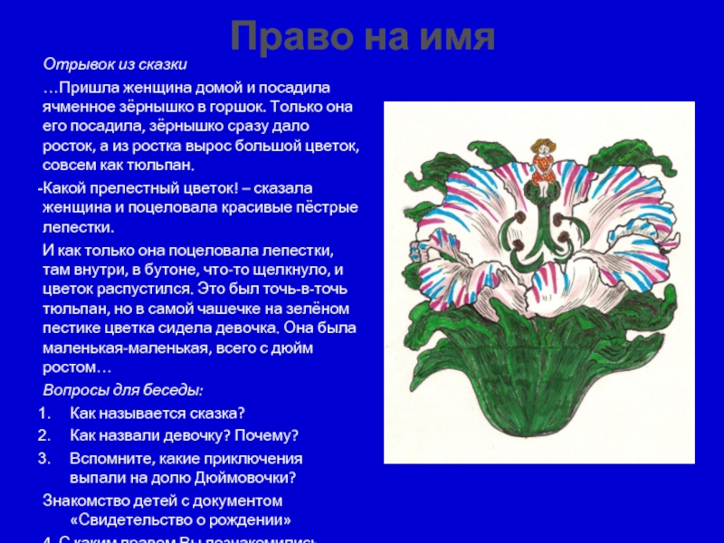 И как только она поцеловала лепестки, там внутри, в бутоне, что-то щелкнуло, и цветок распустился. Это был точь-в-точь тюльпан, но в самой чашечке на зелёном пестике цветка сидела девочка. Она была маленькая-маленькая, всего с дюйм ростом…