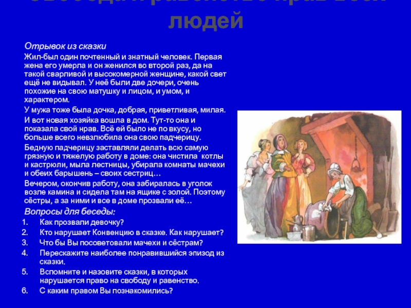 Вспомните и назовите сказки, в которых нарушается право на свободу и равенство.