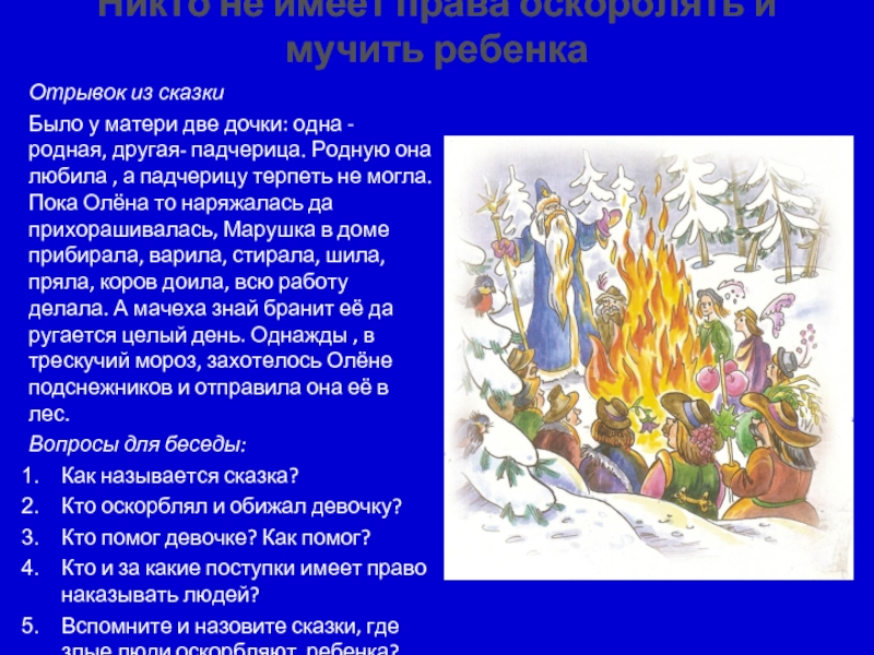 Вспомните и назовите сказки, где злые люди оскорбляют ребенка?