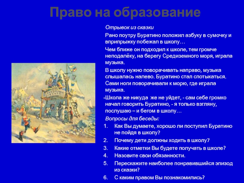 Школа же никуда же не уйдет, - сам себе громко начал говорить Буратино, - я только взгляну, послушаю – и бегом в школу…
