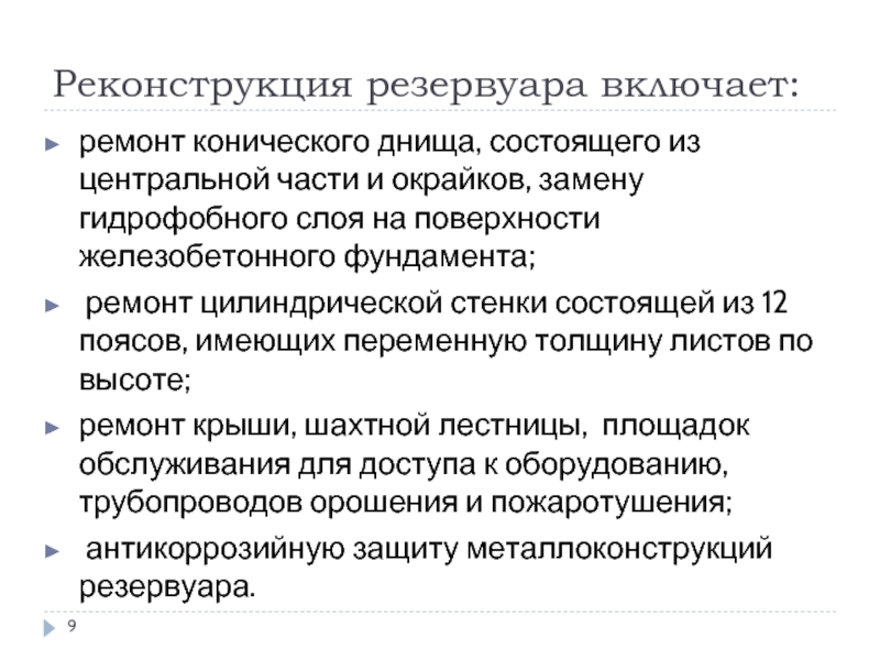 ремонт крыши, шахтной лестницы, площадок обслуживания для доступа к оборудованию, трубопроводов орошения и пожаротушения;