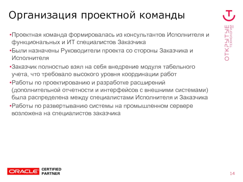 Проектная команда формировалась из консультантов Исполнителя и функциональных и