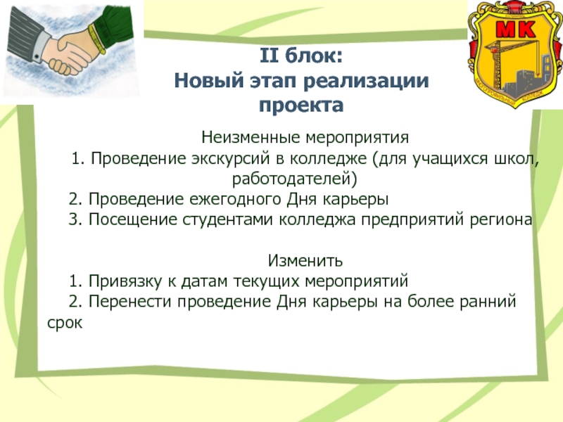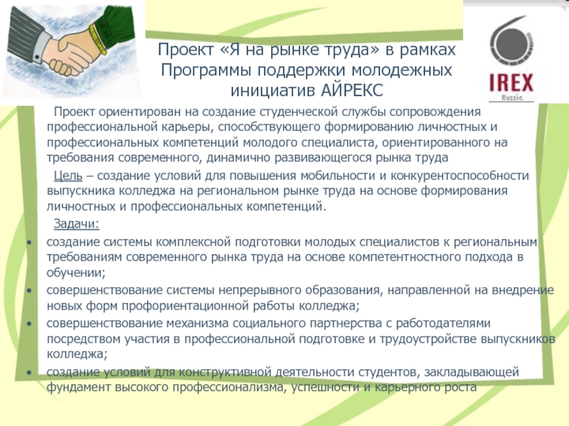 Проект ориентирован на создание студенческой службы сопровождения профессиональной карьеры, способствующего формированию личностных и профессиональных компетенций молодого специалиста, ориентированного на требования современного, динамично развивающегося рынка труда