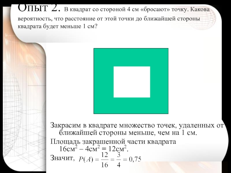 Закрасим в квадрате множество точек, удаленных от ближайшей стороны меньше, чем на 1 см.