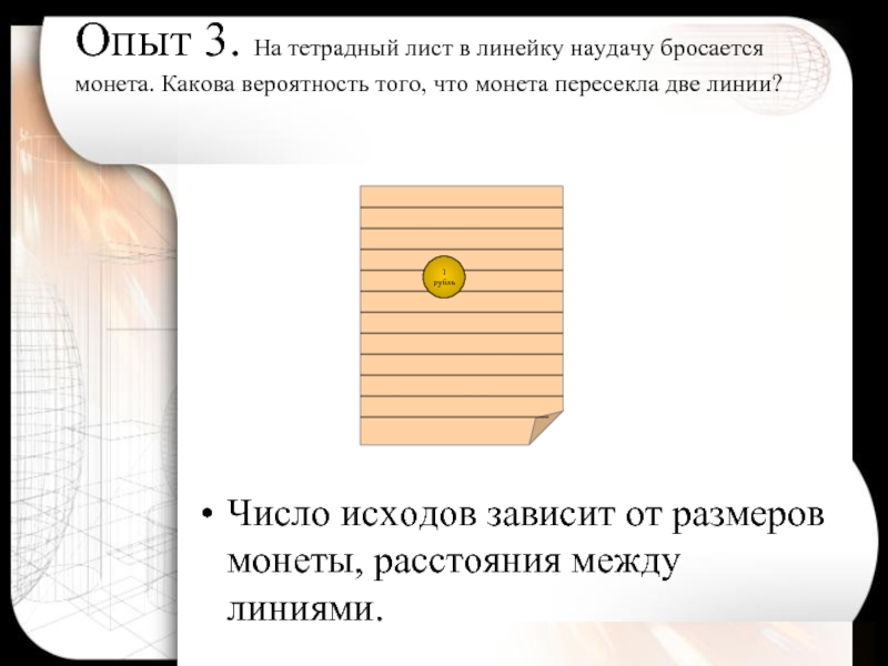 Число исходов зависит от размеров монеты, расстояния между линиями.