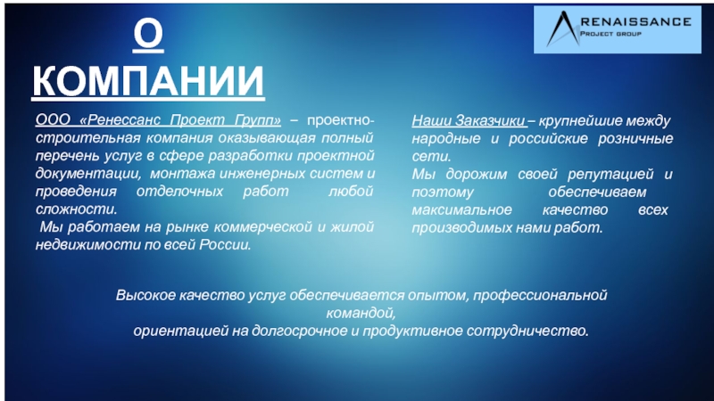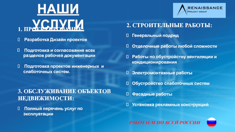 ООО «Ренессанс Проект Групп» – проектно-строительная компания оказывающая полный перечень услуг в сфере разработки проектной документации, монтажа инженерных систем и проведения отделочных работ любой сложности.
