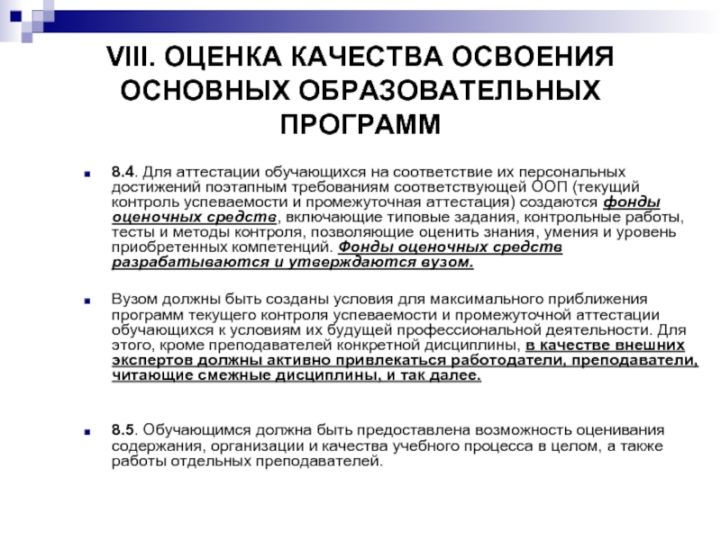 Слайд 19VIII. ОЦЕНКА КАЧЕСТВА ОСВОЕНИЯ ОСНОВНЫХ ОБРАЗОВАТЕЛЬНЫХ ПРОГРАММ