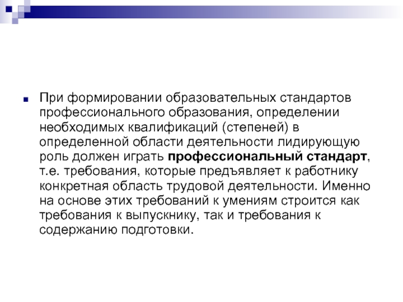 определенной области деятельности лидирующую роль должен играть профессиональный стандарт, т.е. требования, которые предъявляет к работнику конкретная область трудовой деятельности. Именно на основе этих требований к умениям строится как требования к выпускнику, так и требования к содержанию подготовки.