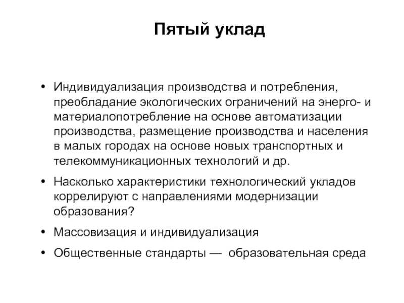 Индивидуализация производства и потребления, преобладание экологических ограничений на энерго- и