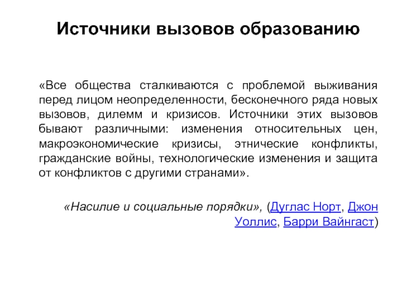 бесконечного ряда новых вызовов, дилемм и кризисов. Источники этих вызовов бывают различными: изменения относительных цен, макроэкономические кризисы, этнические конфликты, гражданские войны, технологические изменения и защита от конфликтов с другими странами».