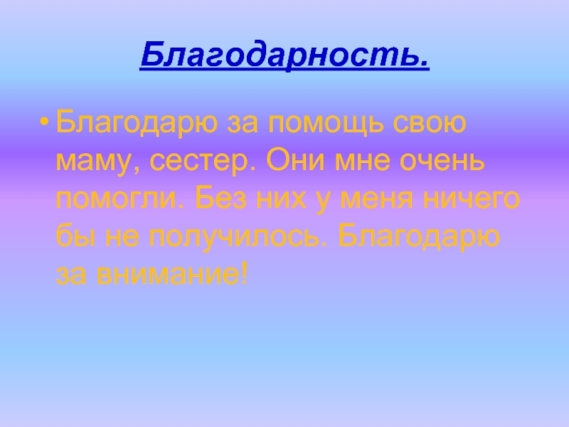 Благодарю за помощь свою маму, сестер. Они мне очень помогли. Без