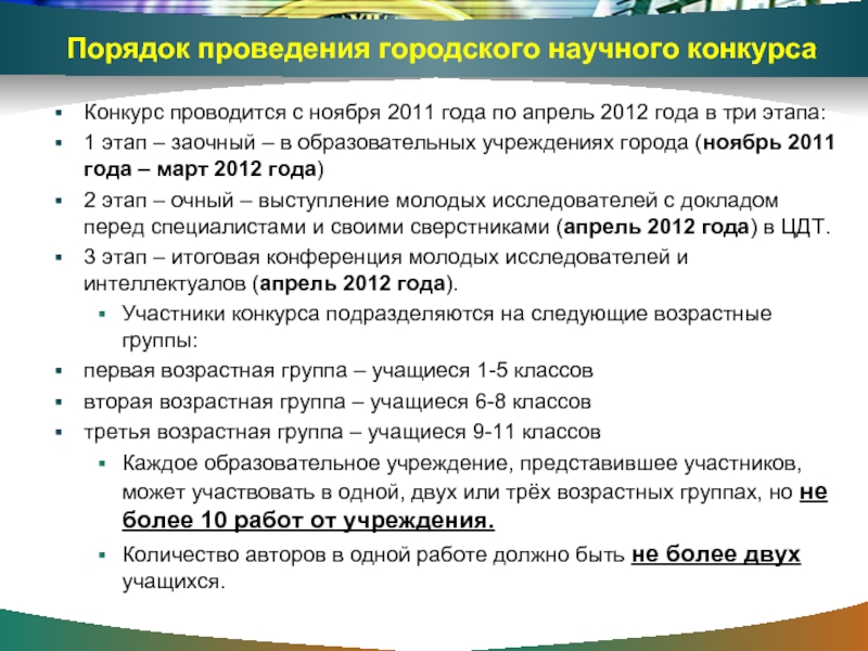 3 этап – итоговая конференция молодых исследователей и интеллектуалов (апрель 2012 года).