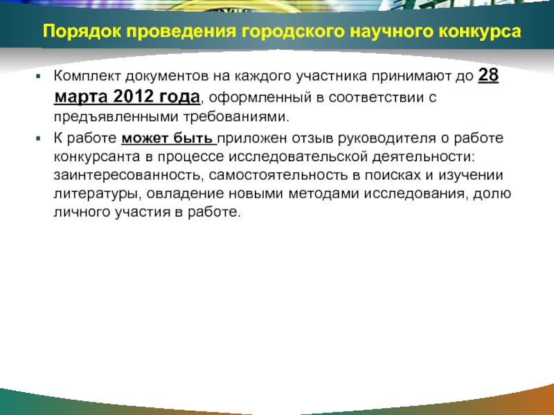 К работе может быть приложен отзыв руководителя о работе конкурсанта в процессе исследовательской деятельности: заинтересованность, самостоятельность в поисках и изучении литературы, овладение новыми методами исследования, долю личного участия в работе.