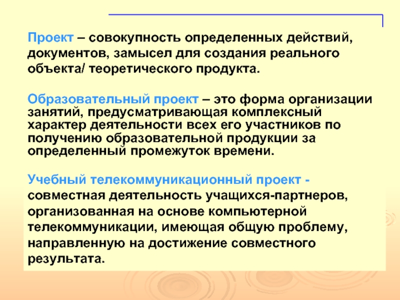 Учебный телекоммуникационный проект - совместная деятельность учащихся-партнеров, организованная на основе компьютерной телекоммуникации, имеющая общую проблему, направленную на достижение совместного результата.