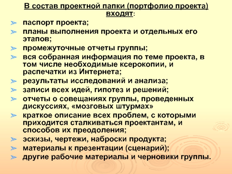 Слайд 18В состав проектной папки (портфолио проекта) входят: