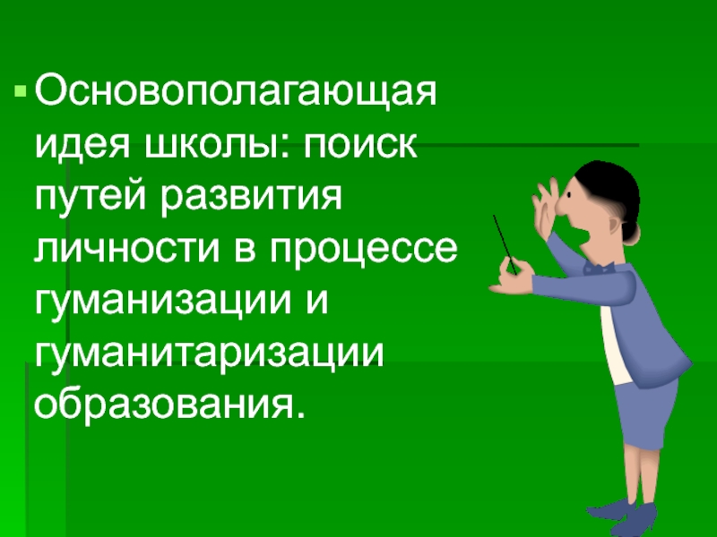Слайд 2Основополагающая идея школы: поиск путей развития личности в процессе гуманизации и