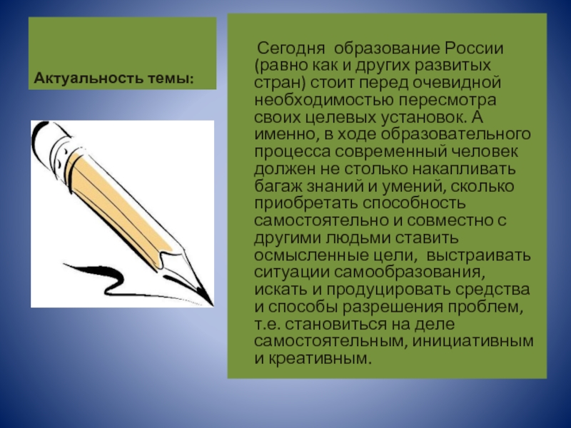 как и других развитых стран) стоит перед очевидной необходимостью пересмотра своих целевых установок. А именно, в ходе образовательного процесса современный человек должен не столько накапливать багаж знаний и умений, сколько приобретать способность самостоятельно и совместно с другими людьми ставить осмысленные цели, выстраивать ситуации самообразования, искать и продуцировать средства и способы разрешения проблем, т.е. становиться на деле самостоятельным, инициативным и креативным.
