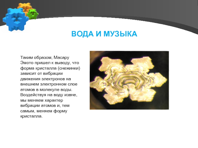 выводу, что форма кристалла (снежинки) зависит от вибрации движения электронов на внешнем электронном слое атомов в молекуле воды. Воздействуя на воду извне, мы меняем характер вибрации атомов и, тем самым, меняем форму кристалла.