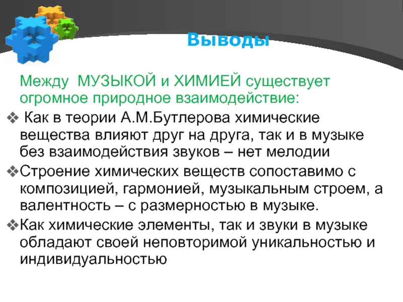 теории А.М.Бутлерова химические вещества влияют друг на друга, так и в музыке без взаимодействия звуков – нет мелодии