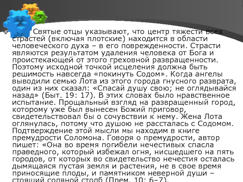 страстей (включая плотские) находится в области человеческого духа – в его поврежденности. Страсти являются результатом удаления человека от Бога и проистекающей от этого греховной развращенности. Поэтому исходной точкой исцеления должна быть решимость навсегда «покинуть Содом». Когда ангелы выводили семью Лота из этого города гнусного разврата, один из них сказал: «Спасай душу свою; не оглядывайся назад» (Быт. 19: 17). В этих словах было нравственное испытание. Прощальный взгляд на развращенный город, которому уже был вынесен Божий приговор, свидетельствовал бы о сочувствии к нему. Жена Лота оглянулась, потому что душою не рассталась с Содомом. Подтверждение этой мысли мы находим в книге премудрости Соломона. Говоря о премудрости, автор пишет: «Она во время погибели нечестивых спасла праведного, который избежал огня, нисшедшего на пять городов, от которых во свидетельство нечестия осталась дымящаяся пустая земля и растения, не в свое время приносящие плоды, и памятником неверной души – стоящий соляной столб (Прем. 10: 6–7).