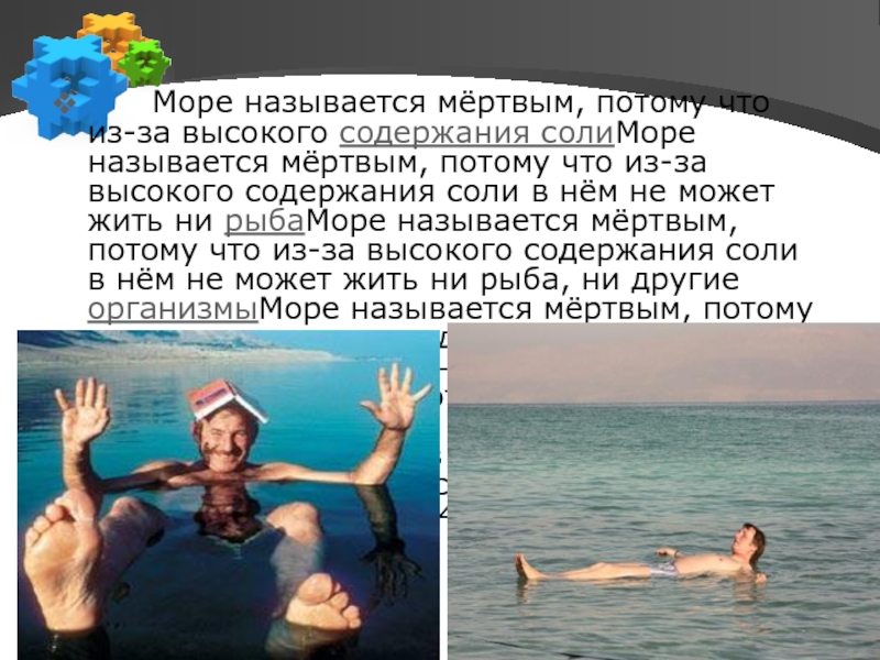 что из-за высокого содержания солиМоре называется мёртвым, потому что из-за высокого содержания соли в нём не может жить ни рыбаМоре называется мёртвым, потому что из-за высокого содержания соли в нём не может жить ни рыба, ни другие организмыМоре называется мёртвым, потому что из-за высокого содержания соли в нём не может жить ни рыба, ни другие организмы (за исключением некоторых видов бактерий в устье реки Иордан). Содержание минеральных веществ в воде достигает 33 %, в среднем 28 % (для сравнения в Средиземном море — 4 %).