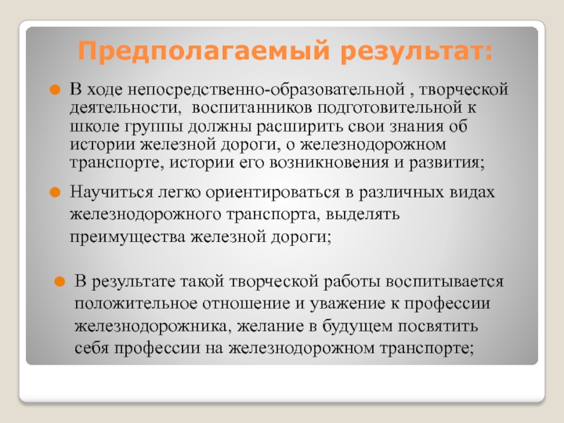В результате такой творческой работы воспитывается положительное отношение и уважение к профессии железнодорожника, желание в будущем посвятить себя профессии на железнодорожном транспорте;