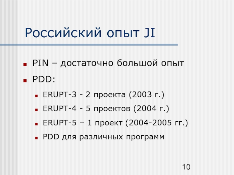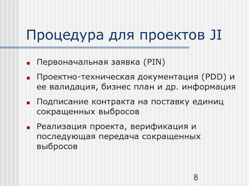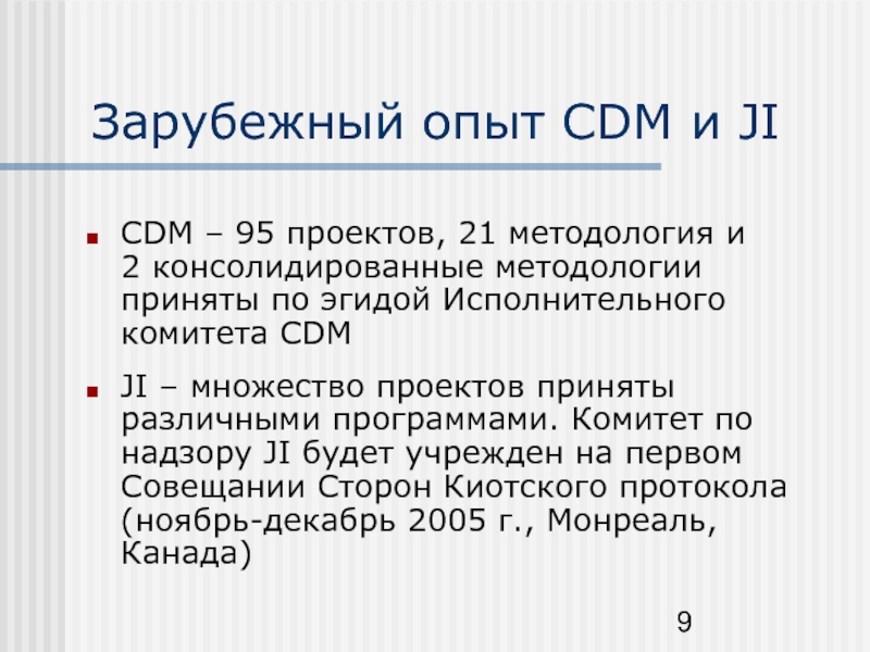 JI – множество проектов приняты различными программами. Комитет по надзору JI будет учрежден на первом Совещании Сторон Киотского протокола (ноябрь-декабрь 2005 г., Монреаль, Канада)