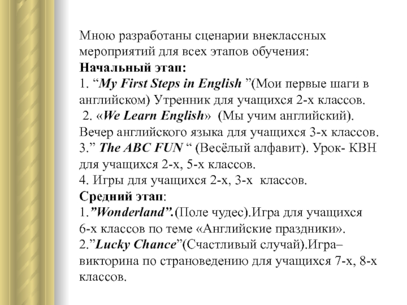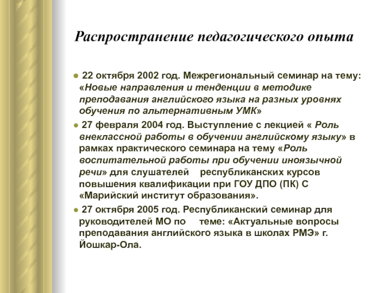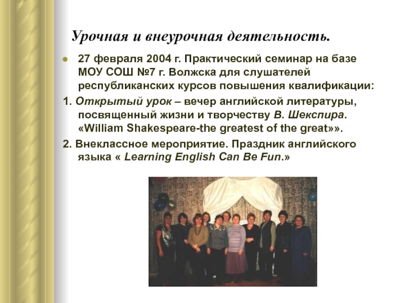 27 февраля 2004 год. Выступление с лекцией « Роль внеклассной работы в обучении английскому языку» в рамках практического семинара на тему «Роль воспитательной работы при обучении иноязычной речи» для слушателей  республиканских курсов повышения квалификации при ГОУ ДПО (ПК) С «Марийский институт образования».