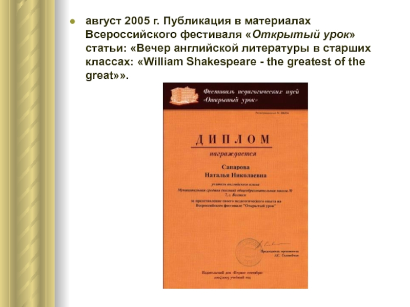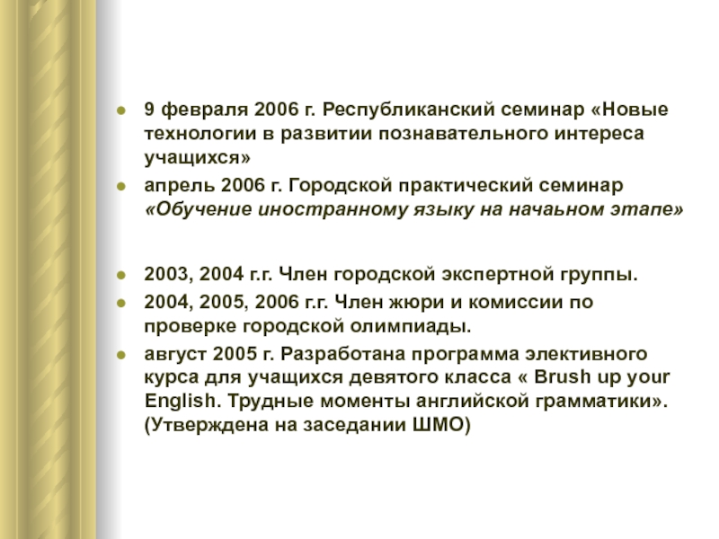 27 октября 2005 год. Республиканский семинар для руководителей МО по   теме: «Актуальные вопросы преподавания английского языка в школах РМЭ» г. Йошкар-Ола.