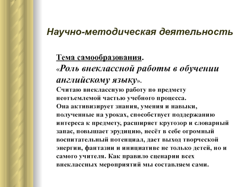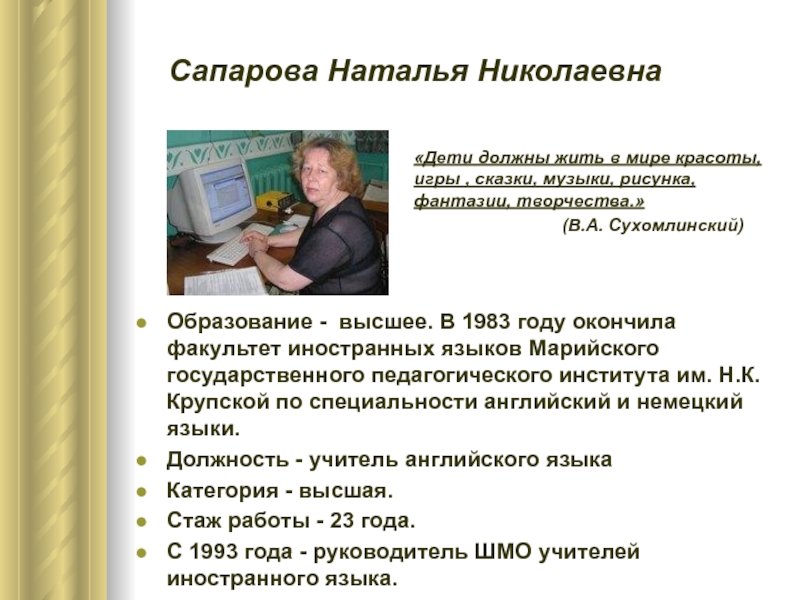 С 1993 года - руководитель ШМО учителей иностранного языка.
