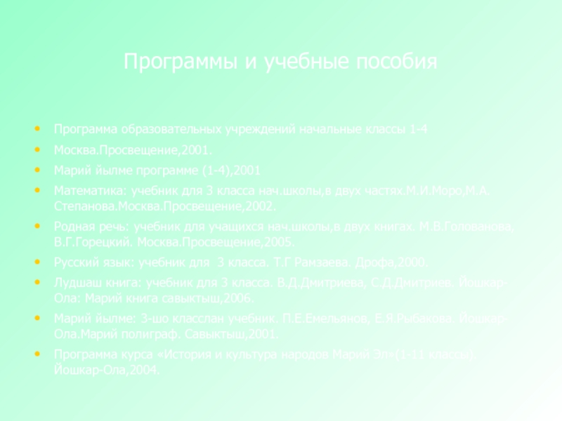 Программа курса «История и культура народов Марий Эл»(1-11 классы). Йошкар-Ола,2004.