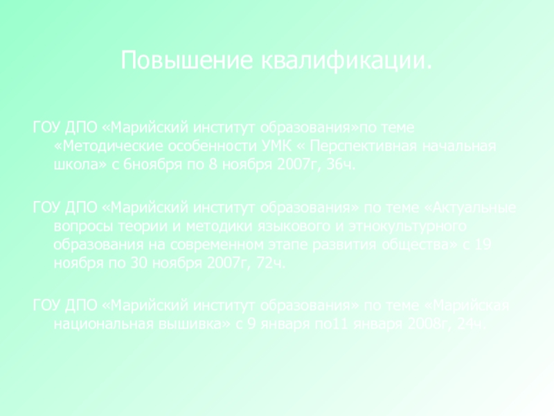 ГОУ ДПО «Марийский институт образования» по теме «Актуальные вопросы теории и методики языкового и этнокультурного образования на современном этапе развития общества» с 19 ноября по 30 ноября 2007г, 72ч.