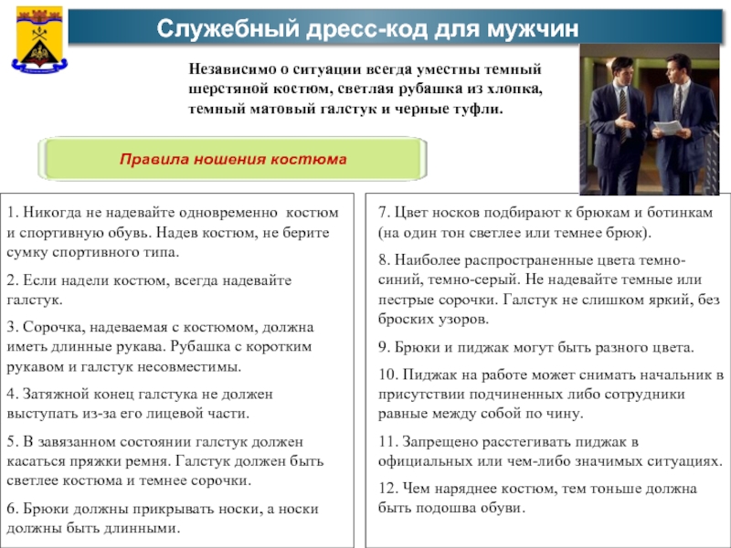 1. Никогда не надевайте одновременно костюм и спортивную обувь. Надев костюм, не берите сумку спортивного типа.
