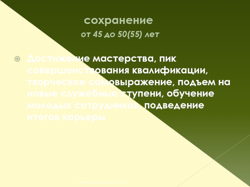 Достижение мастерства, пик совершенствования квалификации, творческое самовыражение, подъем на новые служебные ступени, обучение молодых сотрудников, подведение итогов карьеры