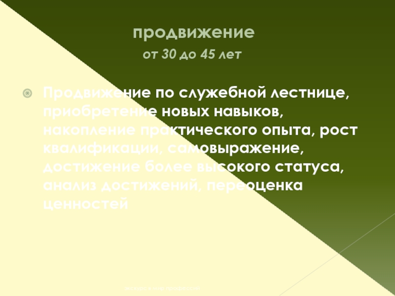 Продвижение по служебной лестнице, приобретение новых навыков, накопление практического опыта, рост квалификации, самовыражение, достижение более высокого статуса, анализ достижений, переоценка ценностей