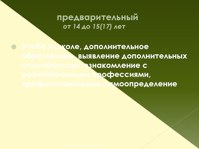 Учеба в школе, дополнительное образование, выявление дополнительных способностей, ознакомление с разнообразными профессиями, профессиональное самоопределение