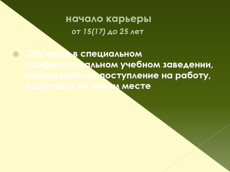Обучение в специальном профессиональном учебном заведении, поиски работы, поступление на работу, адаптация на новом месте