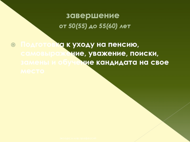 Подготовка к уходу на пенсию, самовыражение, уважение, поиски, замены и обучение кандидата на свое место