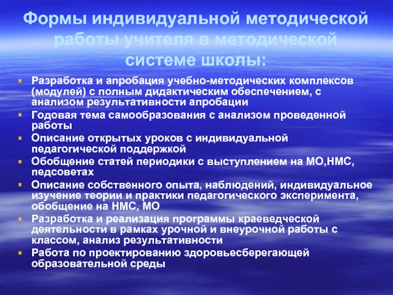 Слайд 8Формы индивидуальной методической работы учителя в методической системе школы: