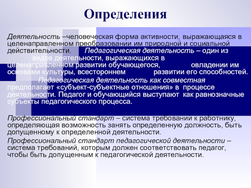 и социальной действительности. Педагогическая деятельность – один из видов деятельности, выражающихся в целенаправленном развитии обучающегося, овладении им основами культуры, всестороннем развитии его способностей.