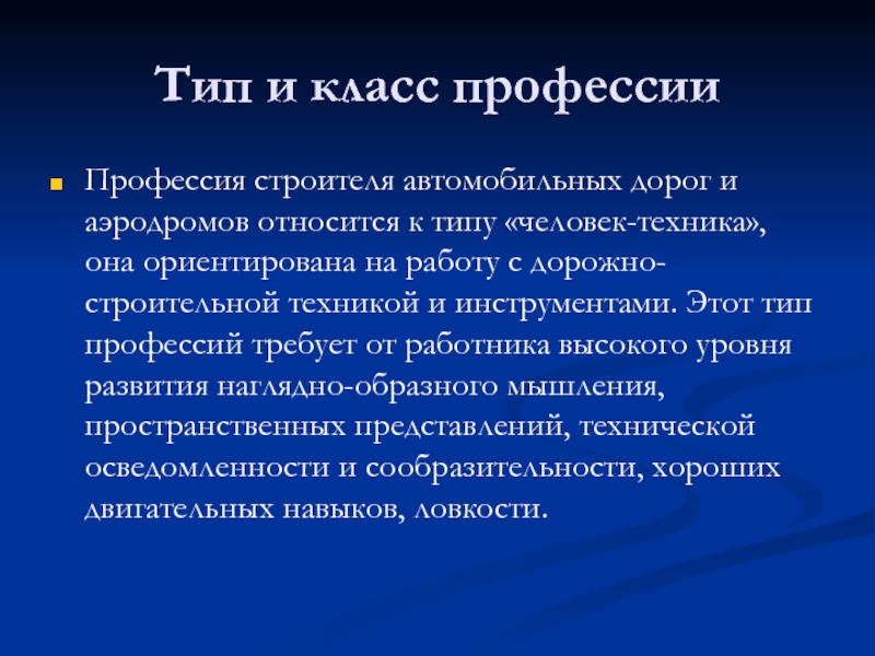 типу «человек-техника», она ориентирована на работу с дорожно-строительной техникой и инструментами. Этот тип профессий требует от работника высокого уровня развития наглядно-образного мышления, пространственных представлений, технической осведомленности и сообразительности, хороших двигательных навыков, ловкости.