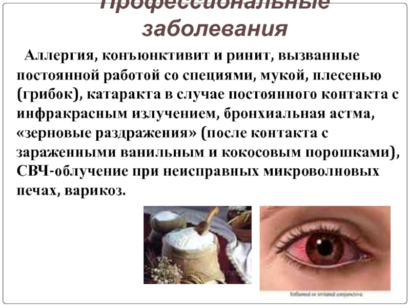 со специями, мукой, плесенью (грибок), катаракта в случае постоянного контакта с инфракрасным излучением, бронхиальная астма, «зерновые раздражения» (после контакта с зараженными ванильным и кокосовым порошками), СВЧ-облучение при неисправных микроволновых печах, варикоз.