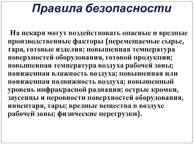 производственные факторы (перемещаемые сырье, тара, готовые изделия; повышенная температура поверхностей оборудования, готовой продукции; повышенная температура воздуха рабочей зоны; пониженная влажность воздуха; повышенная или пониженная подвижность воздуха; повышенный уровень инфракрасной радиации; острые кромки, заусенцы и неровности поверхностей оборудования, инвентаря, тары; вредные вещества в воздухе рабочей зоны; физические перегрузки).