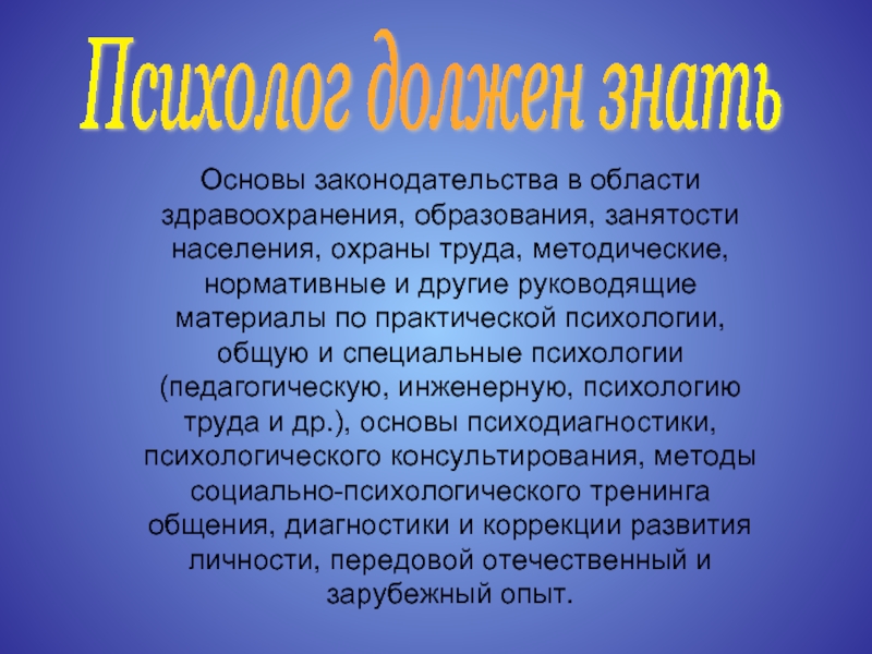 труда, методические, нормативные и другие руководящие материалы по практической психологии, общую и специальные психологии (педагогическую, инженерную, психологию труда и др.), основы психодиагностики, психологического консультирования, методы социально-психологического тренинга общения, диагностики и коррекции развития личности, передовой отечественный и зарубежный опыт.