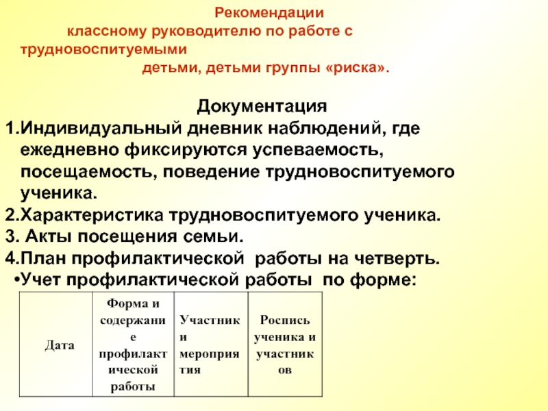 Важное значение имеет подготовка учителей для работы с трудными детьми. Практика показывает, что учителя часто не имеют социально-педагогической подготовки. Необходимо сотрудничество с подготовленными кадрами — психологами, социальными педагогами.