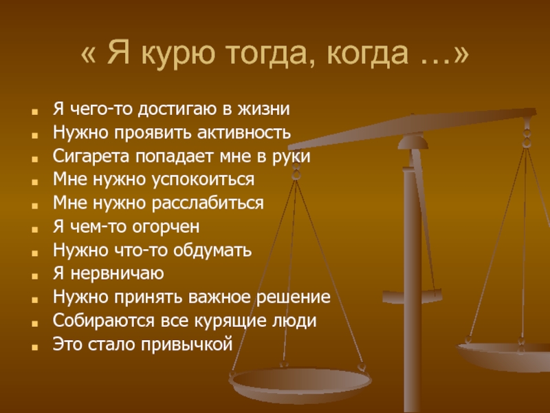 Вы курите без разбора, не замечая количество и качество сигарет, которые курите, каждый раз, когда вы берете сигарету, задавайте себе вопрос: а хочу ли я курить? Вы будете удивлены, как часто вы не хотите.