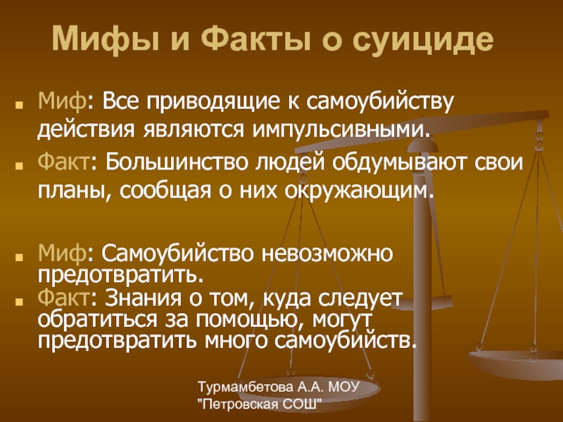 Отказ от ложных представлений о том, что люди, рассуждающие о самоубийстве, его не совершают, что суицид – исключительно импульсивный акт, осуществляемый без колебаний.
