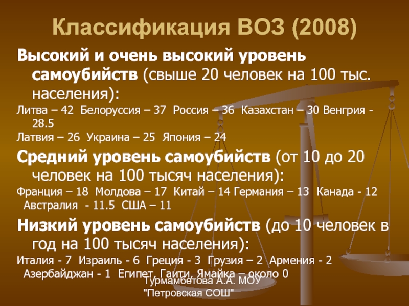 Низкий уровень самоубийств (до 10 человек в год на 100 тысяч населения):