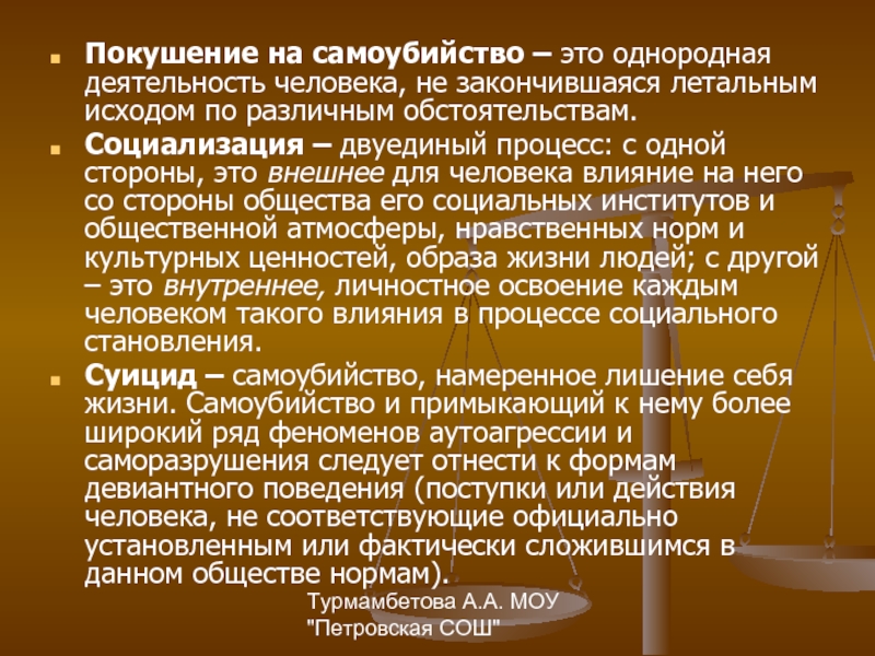 Суицид – самоубийство, намеренное лишение себя жизни. Самоубийство и примыкающий к нему более широкий ряд феноменов аутоагрессии и саморазрушения следует отнести к формам девиантного поведения (поступки или действия человека, не соответствующие официально установленным или фактически сложившимся в данном обществе нормам).