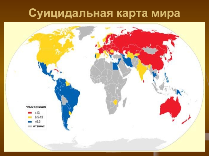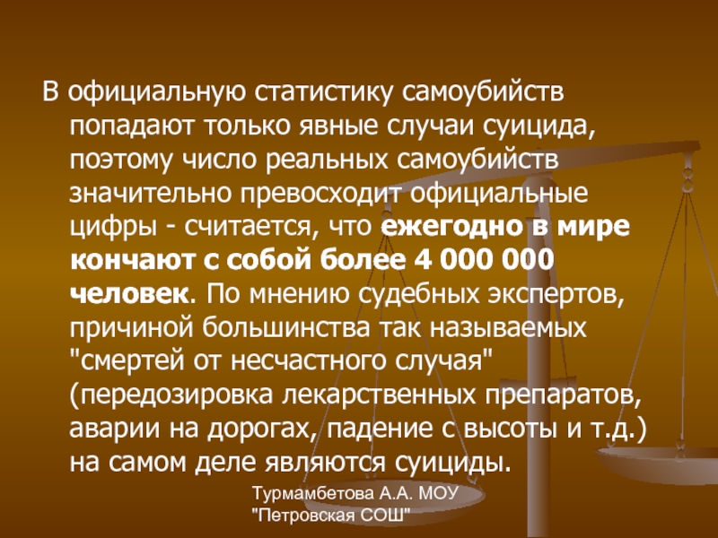 явные случаи суицида, поэтому число реальных самоубийств значительно превосходит официальные цифры - считается, что ежегодно в мире кончают с собой более 4 000 000 человек. По мнению судебных экспертов, причиной большинства так называемых "смертей от несчастного случая" (передозировка лекарственных препаратов, аварии на дорогах, падение с высоты и т.д.) на самом деле являются суициды.